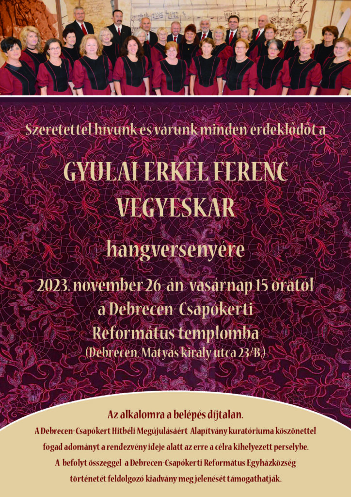 A Csapókerti Egyházközség szeretettel hív mindenkit Gyulai Erkel Ferenc Vegyeskar hangversenyére 2023. november 26-án 15:00 órától.