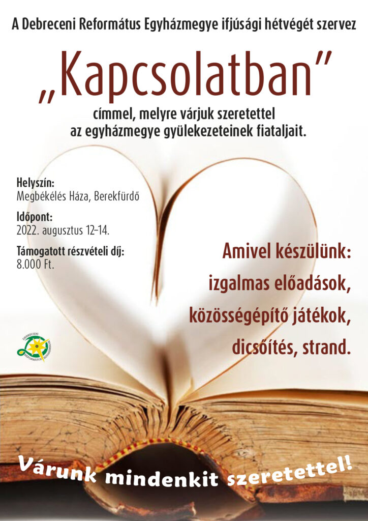 Szeretettel várjuk az Egyházmegye Gyülekezeteinek már konfirmált vagy ezen korosztálynak megfelelő fiataljait ifis hétvégére Berekfürdőre 2022. augusztus 12-14. között, péntek ebédtől vasárnap ebédig. Gazdag programmal készülünk. A mellékelt plakát segít az alkalom hirdetésében. Kérjük, hogy a jelentkezéseket a mellékelt adatlapon összesítve küldjék el az Esperesi Hivatal email címére 2022. augusztus 1-ig.