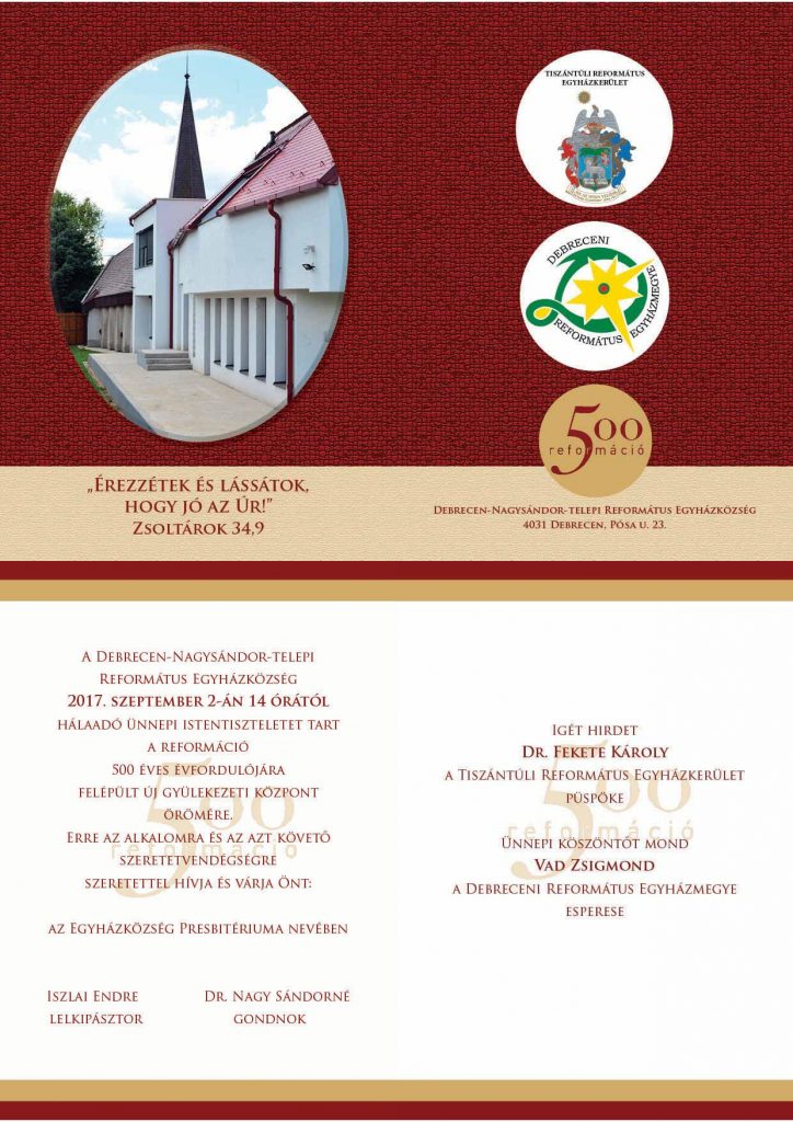 Hálaadó ünnepi istentiszteletet tart a Debrecen-Nagysándor-telepi Református Egyházközség.